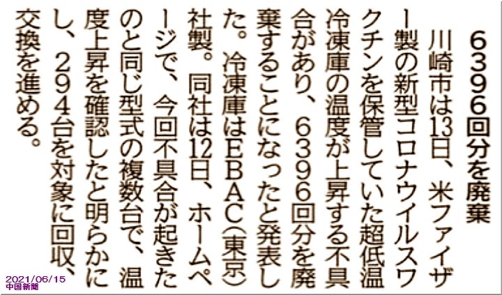 中国新聞sanの朝刊記事によりますと、米ファイザー製新型コロナワクチンを保管していた超低温冷凍庫の温度が上昇する不具合があり、6,396回分を廃棄する事になりましたとか…