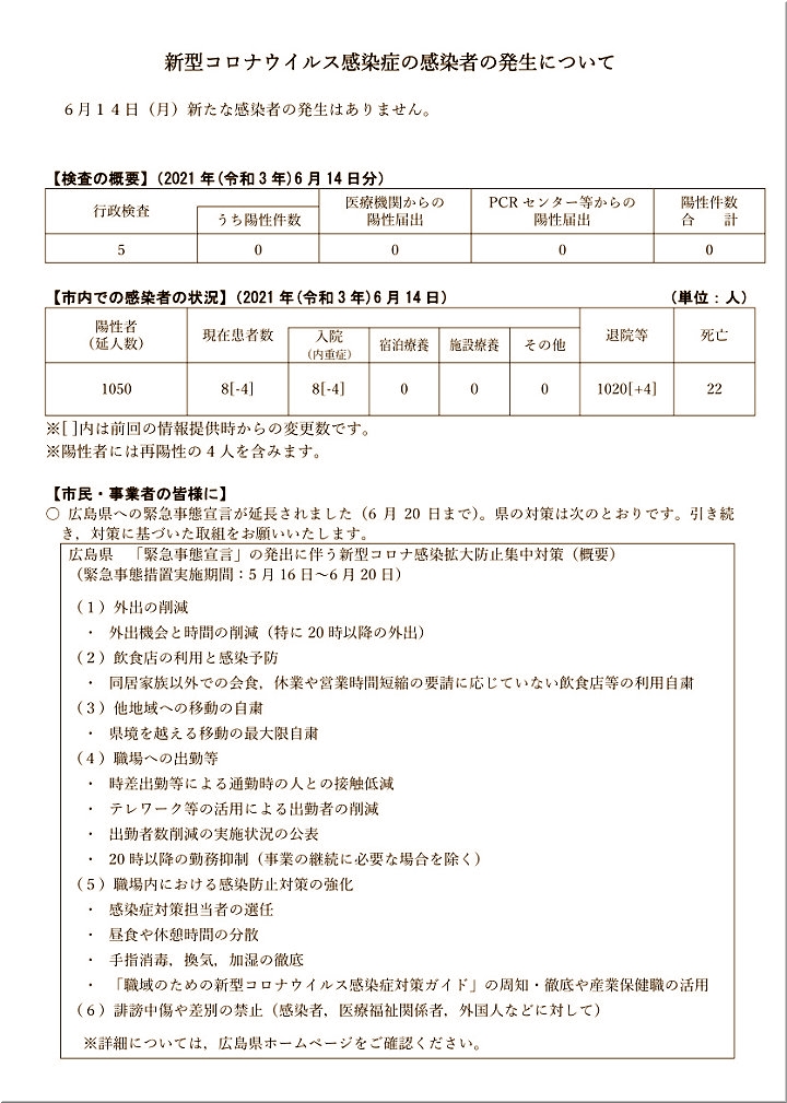 市が確認した感染者は3月は計10人だったが、4月以降に急増。同月は146人、5月は298人となり、月別で最多だった昨年12月の214人を超えた。広島県に緊急事態宣言が出た5月中旬から減少し、6月は12人(14日現在)になっている。市保健予防課は宣言後に人流が抑えられたことが要因と受け止める。