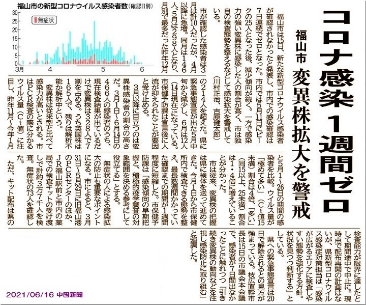 福山市内では、5月11日にピークの25人となった後、減少傾向が続く一方で、感染力の強い変異株に感染した人の割合が高くなっていますとか…変異株拡大が気になりますけど、とにかく市民の該当者の皆様が、一日も早く2回のワクチン接種完了まで、このコロナ感染「ゼロ」が続いて欲しいものであります。