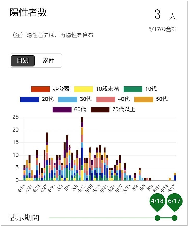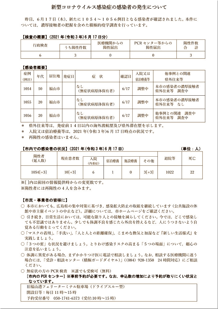 6/17(木)、1054〜1056例目となる3人の感染者が確認されました。詳細は画像のとおりです。