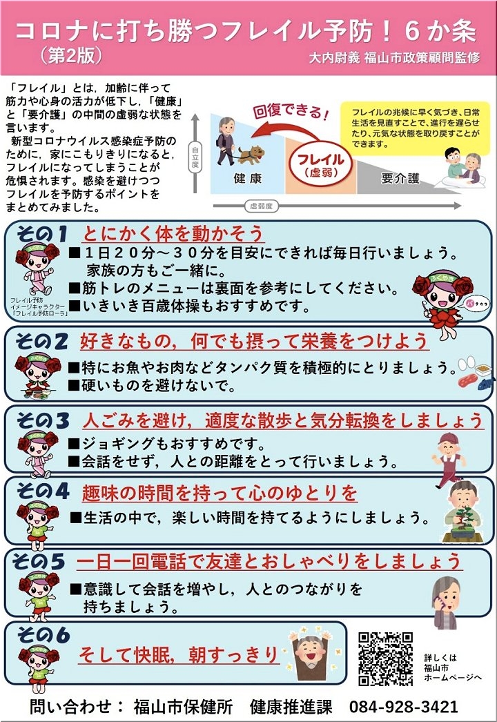 また、外出自粛により、高齢者がフレイル状態(虚弱)に陥るコロナフレイルが懸念されています。感染を避けつつフレイルを予防しましょう。