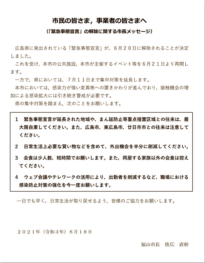 これを受けまして、昨日は、福山市・枝広市長sanのメッセージも…