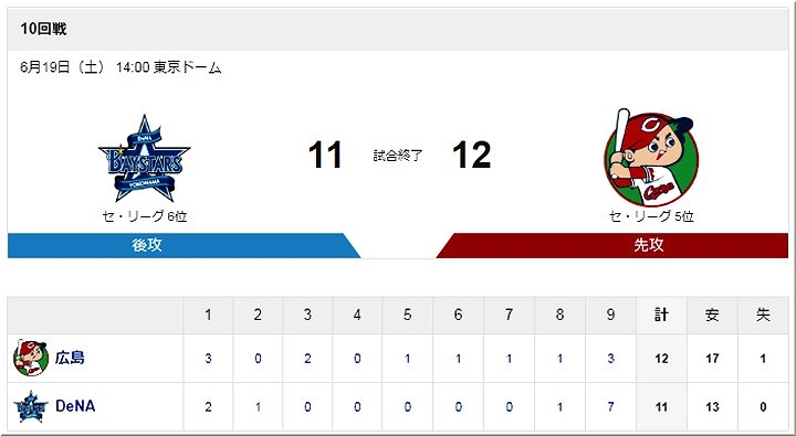 広島は同点で迎えた3回表、林の適時打などで勝ち越しに成功する。その後は菊池涼、林、中村奨にソロが飛び出すなど、終わってみれば17安打で12得点を挙げた。投げては、先発・森下が7回3失点の好投で今季4勝目。敗れたDeNAは、最終回に1点差まで追い上げるも、あと一歩及ばなかった。