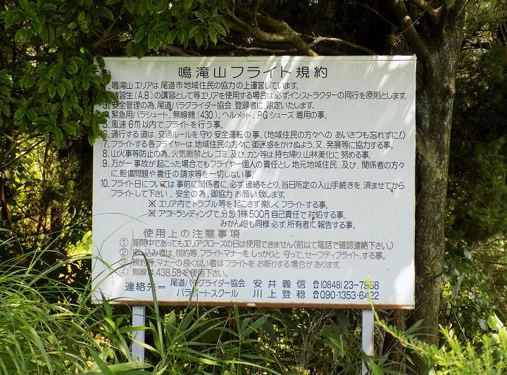 雑草が生い茂りましたフライト広場の一角には、何やら注意書きが…近寄って見ますと、尾道パラグライダー協会sanの「鳴滝山フライト規約」が記載されてありました。