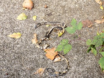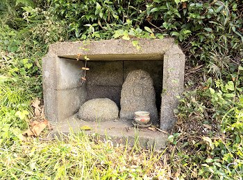 民家と畑の間の小径を進みますと正面に石仏が…これも中世の作なんでしょうねぇ〜何気なく足元に眼を移しますと、干からびた蛇の死骸が…