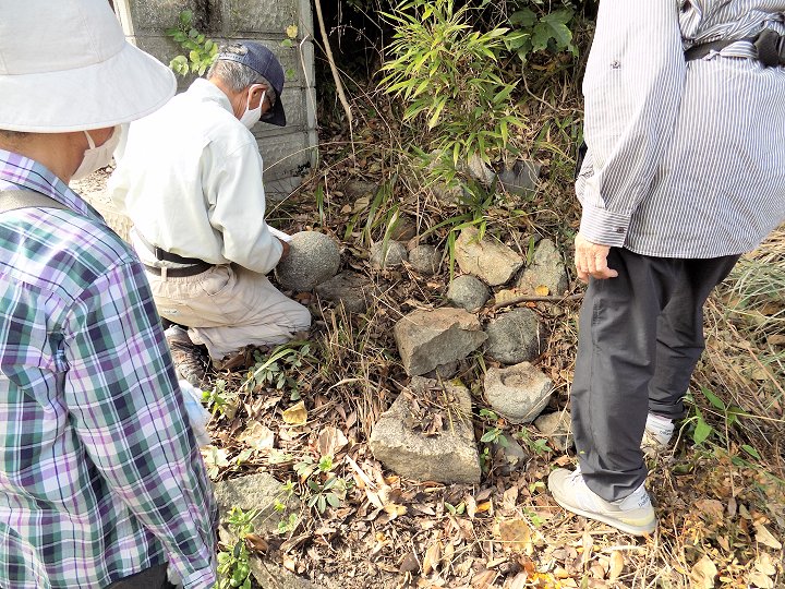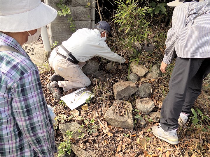 ここでは、散乱しています石造物を確認です。以前も調査しておられますのでしょうか…リーダーは、過去の調査資料を確認しながら、何やら加筆しておられます。