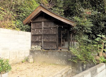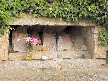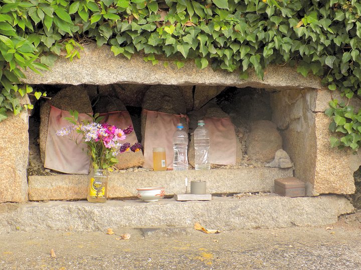 山裾に旨く組み込んだお堂です。堂内には石造地蔵仏が五体あるが、向かって右端は何か不明。五輪塔の片割れなんでしょうねぇ〜