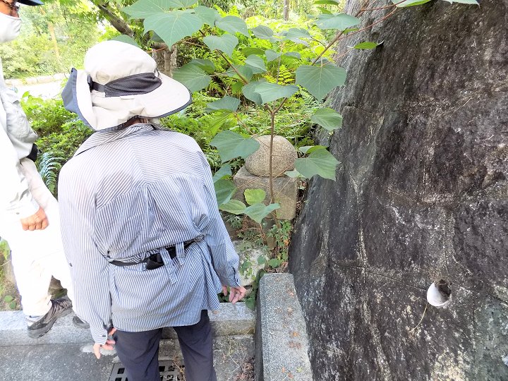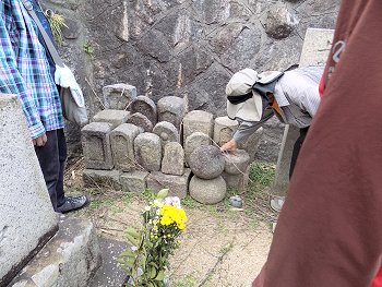 高泉寺の境内に引き返そうとしていますと、女性のお一人が「こんな所にも五輪塔が…今まで気付かなかったのに…」と。これにはリーダーも「んっ!?」と確認です。