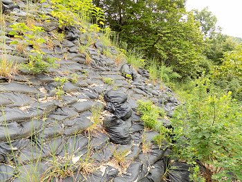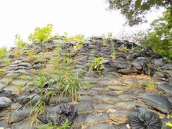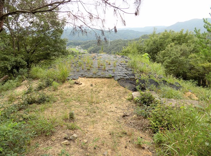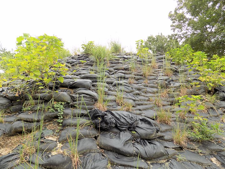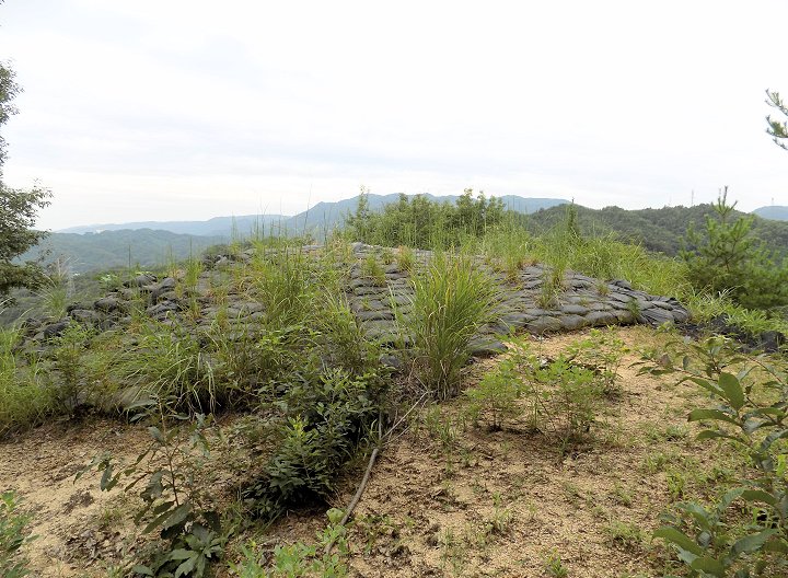 ヤッと辿り着きますと、墳丘らしき、こんもりと盛り上がった箇所全体が、黒ビニールに包まれました土嚢に覆われておりました。多分、これが尾市古墳と思われます。