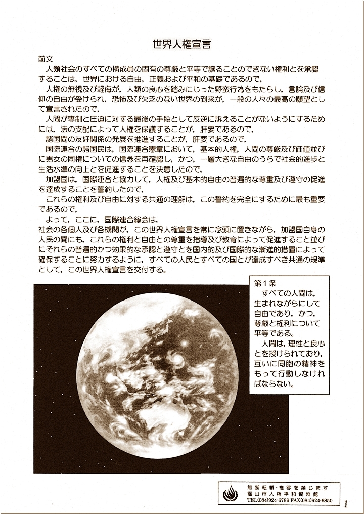何もかも失ってしまいます悲惨な戦争…世界各地で未だに行われておりますけど、国際連合は、「すべての人民とすべての国とが達成すべき共通の基準」として『世界人権宣言』を交付しております。この宣言通り、言論及び信仰の自由が受けられ、恐怖及び欠乏の無い世界の到来を、切に望みたいものであります。