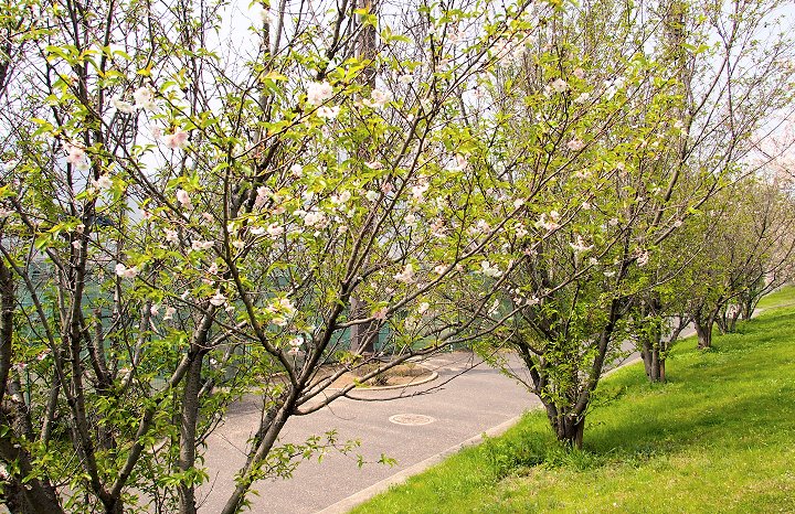 ジュウガツザクラは、こんな感じでテニスコート脇の堤下に8本ばかり並んでおります。満開になりますと、それなりにキレイなのですけどネ(^.-)☆