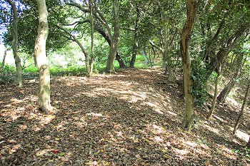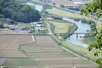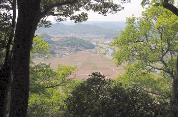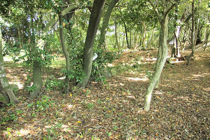 周辺を見廻しますと、草に覆われていて分かりにくいですが、窪んだあたりが大手門跡なのかも分かりません。三の丸の南東側に大手門跡があったのでしょうけど、石垣などは分かりませんでしたネ。三の丸からは、小田川流域を一望することができます。