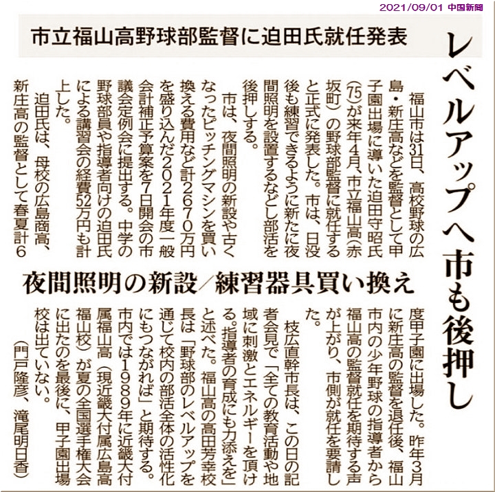 昨日に続いて本日もまた中国新聞sanの朝刊に、福山市立福山高等学校の野球部監督に迫田守昭sanの監督就任の話題が…