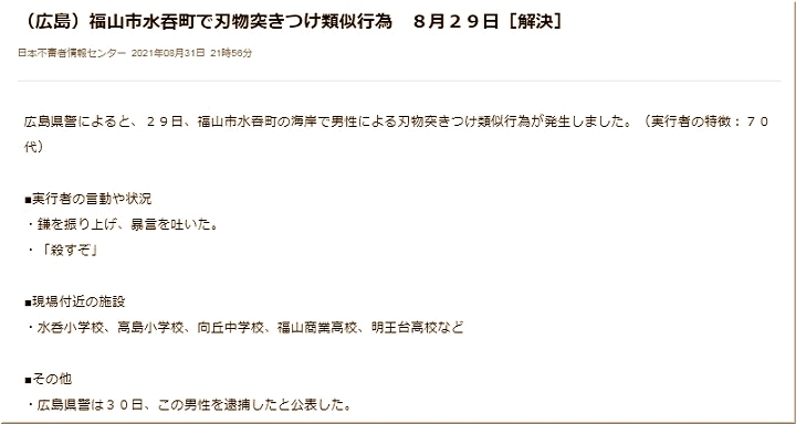 そぅしましたら、うん、うん、8/29(日)に、殺人未遂事件と言うか類似事件が発生はしていますようですねぇ〜
