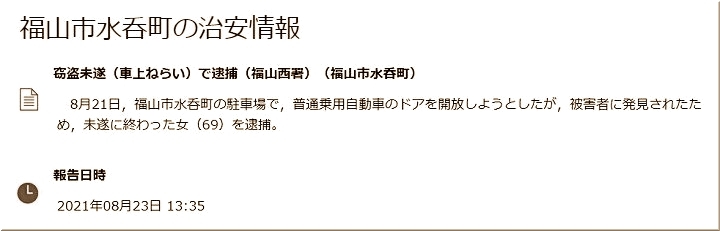 ふ〜ん、水呑町は平和な暮らし易い文教地区かと思いましたら、そぅでも無さそうですねぇ〜直近では、8/21(土)に69歳の女性が「窃盗未遂(車上ねらい)」で逮捕されましたとか…