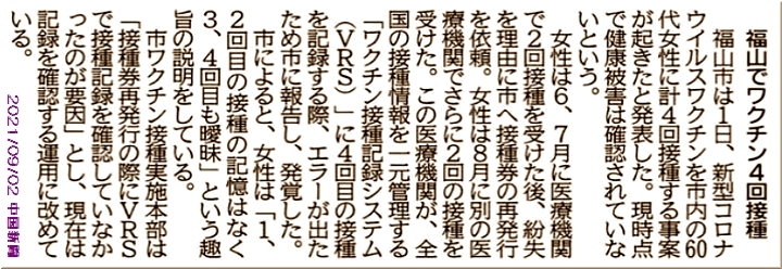 そぅそぅ、この、鎌突きつけ事件を中国新聞sanの朝刊で捜しておりまして、眼に入りましたのが「福山でワクチン4回接種」の記事でした。