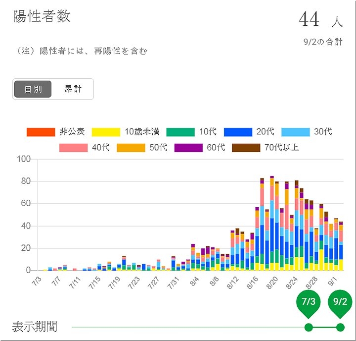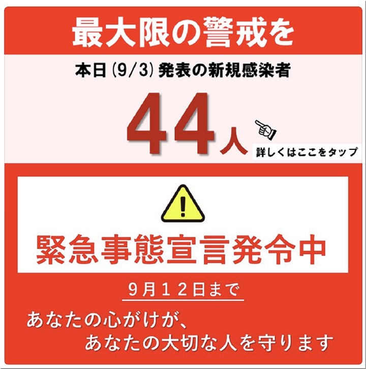 9/2(木)、2613〜2656例目となる44人の感染者が確認されました。連日、数多くの感染者が確認されています。市民一人ひとりの慎重な行動をお願いします。
