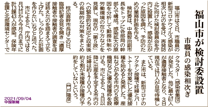 市民への指導的立場にあります福山市役所でも、8/22(日)に、市職員19人(情報発信課2人、保険年金課10人、北部環境センター5人、健康推進課1人、港湾河川課1人)の感染が確認されクラスター発生。この件に関連し、今朝の中国新聞紙面に、こんな記事掲載も…福山市は「再発防止に向けた検討委員会」を庁内に設置された様子。