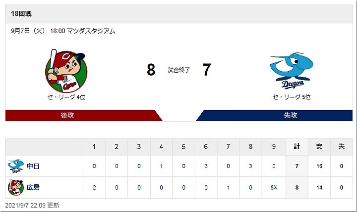 ◇セ・リーグ 広島8ー7中日(2021年9月7日 マツダ)