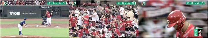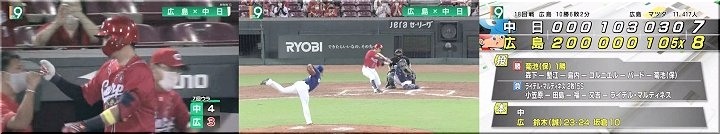 広島 -- 鈴木誠 23号(1回裏2ラン) 、鈴木誠 24号(7回裏ソロ) 、坂倉 10号(9回裏3ラン)