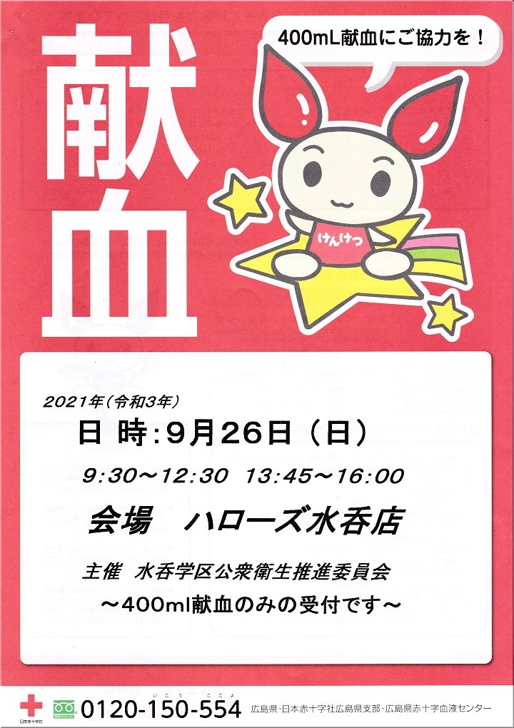会場は、ハローズ水呑店で、9/26(日)に終日のようであります。健康な方々からの多数の献血がありますと宜しいですネ(^-^)//"
