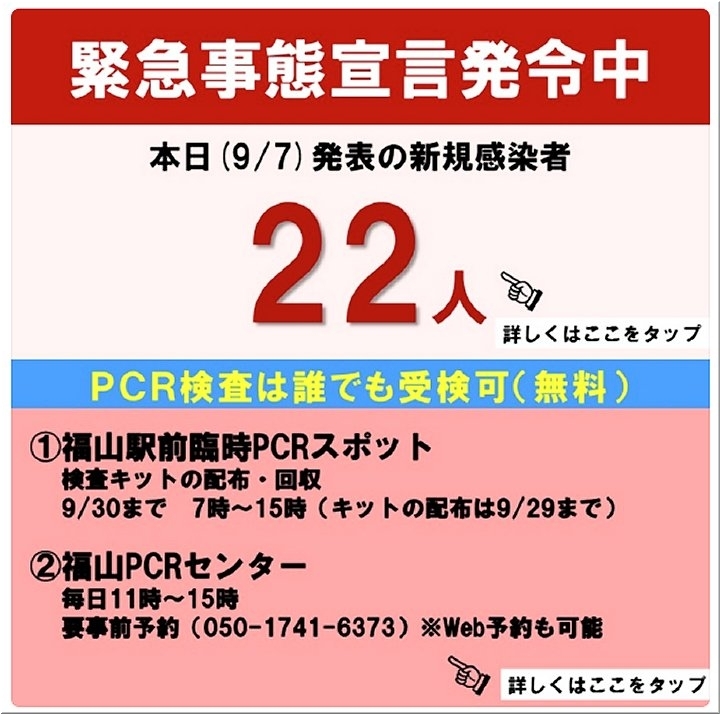 福山駅前臨時PCRスポットの開設期間を、9/30まで延長します。事前予約なしで利用でき、同居家族分の検査キットをまとめて受け取ることも可能です。症状がなくても、感染への不安を感じた場合は積極的にPCR検査を受けてください。