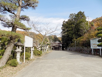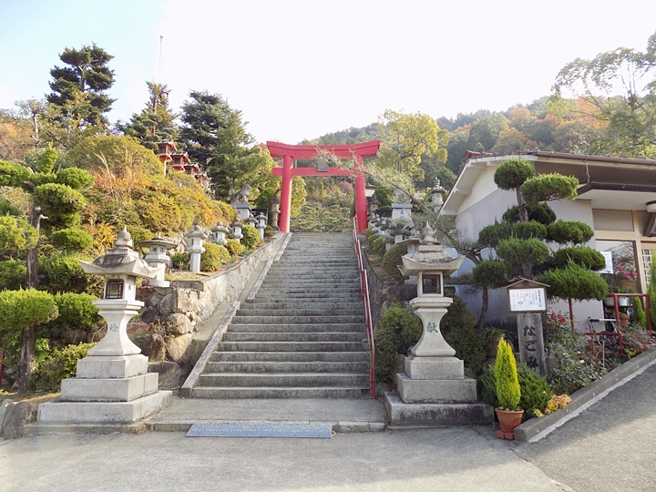 この駐車場に車を駐め、駐車場から出てすぐ右手の坂道を上ります。そして、休憩所「和(なごみ)」の左手にある石段を上がり、拝殿へ向かいます。赤い鳥居をくぐると、拝殿がある境内です。