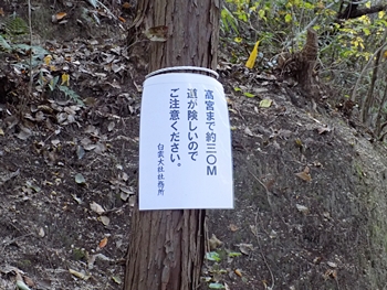 「高宮」に向かって上がっていますと、途中、樹木に、『高宮まで約30M 道が険しいので ご注意下さい 白雲大社社務所』の注意書きが…