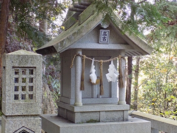 境内の中で最も高い位置にある御社。地元の笠神社が荒廃していた折、神様は普段この応神山の奥におられるとの謂れから八幡神を祀り、又四方全国の高神様を拝する御社としている。
