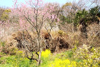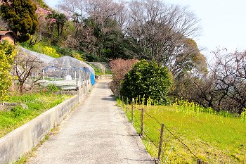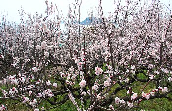 写真は、梅の花が咲き誇る十三仏周辺の様子。このあたりには、田尻なんきん畑も広がっています。なんきん畑周辺に菜の花、梅の花が咲き誇り見事なハーモニーを醸し出しています。梅が終わると杏のが彩を加えて、一層可愛さを増すのです。