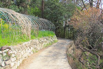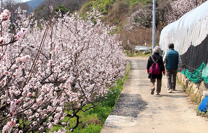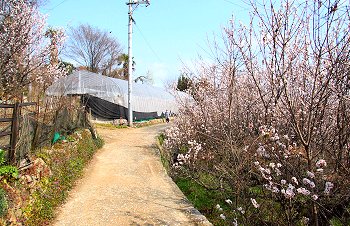 復路は、往路よりズッと下側の散策ロードをノンビリと。狭い小径を歩いておりますと、満開の杏畑が正面に(^_^)v
