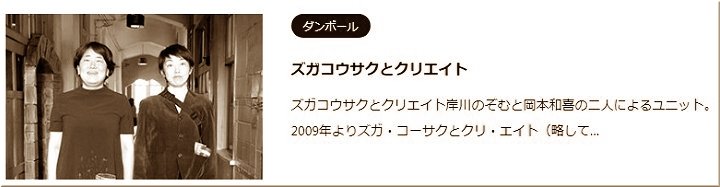 大阪・神戸在住の、「岸川のぞむ」と「岡本和喜」の二人によるユニット。2009年よりズガ・コーサクとクリ・エイト(略してズカクリ)としての活動を始める。