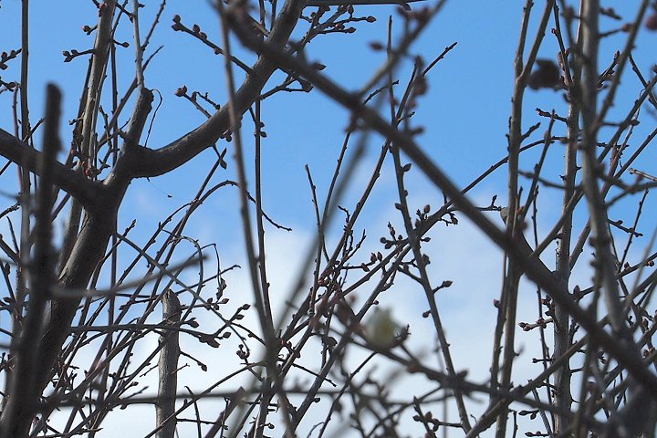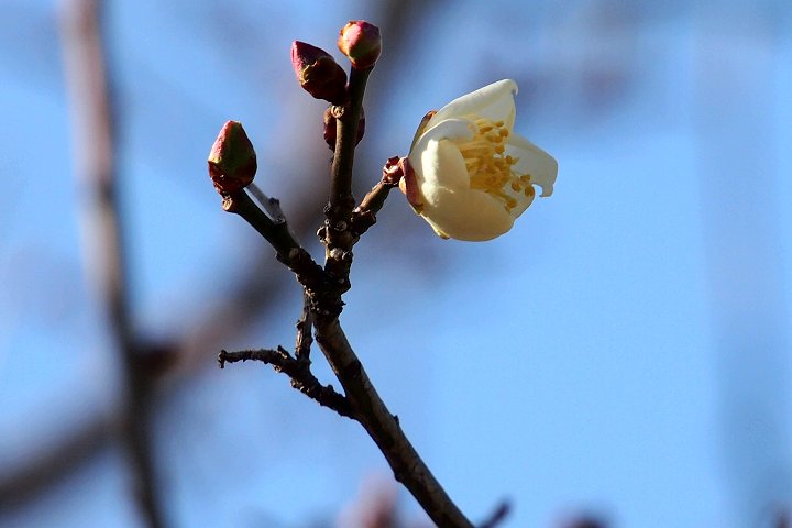 そして、まだ蕾状態だなぁ〜と暫く梅の木に眼を向けておりました。ら、よくよく見ますと、たった一つだけ開花です(^_^)v