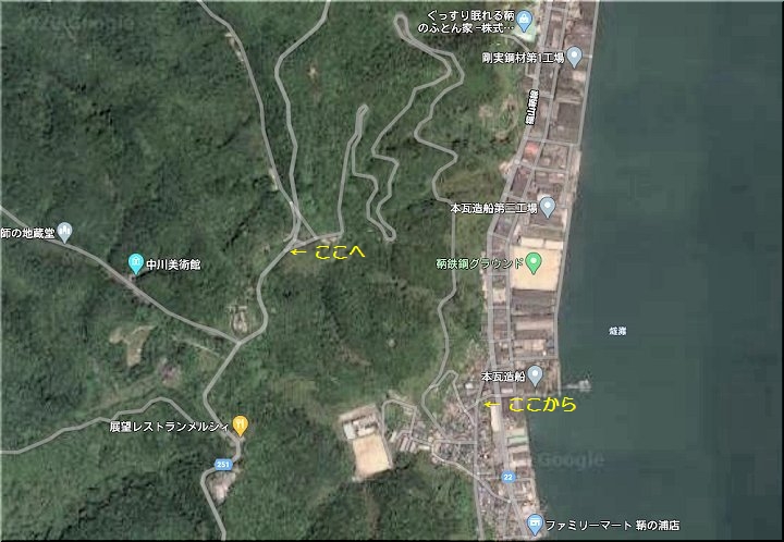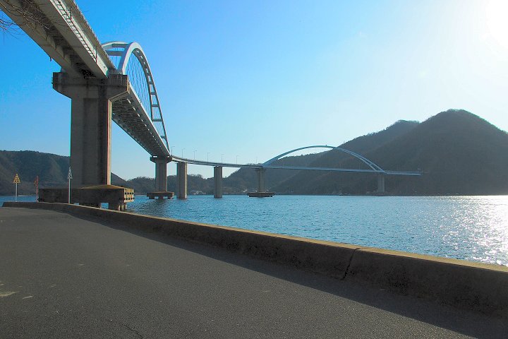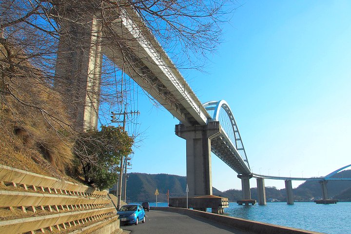 暫し内海大橋下の景観を楽しみましてからは、海岸沿いを常石造船を通り抜け、尾道市浦崎方向に走行です。