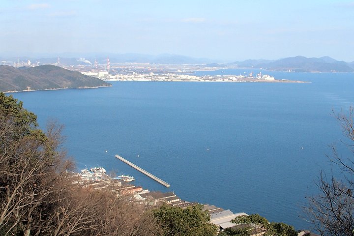仙酔島、その後方に走島、、仙酔島と鞆の町の間に弁天島。そして、JFE・箕沖工業団地、その後方に笠岡湾干拓地が臨めます。