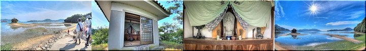 大潮の時期、干潮の時間を狙って浦崎の沖の観音へたどり着くと、歩いて渡れる砂浜が出現します。足元を濡らすのがイヤな方は長靴持参でお詣りすることをオススメします。