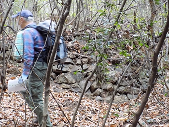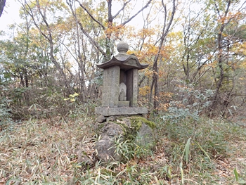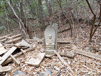 要所要所でリーダーの説明を受けながら進んで行きますと、廃材に囲まれた中央に石仏が…ここには、木造の祠がありましたのでしょうけど、老朽の進行で自然解体となりましたのでしょうか…