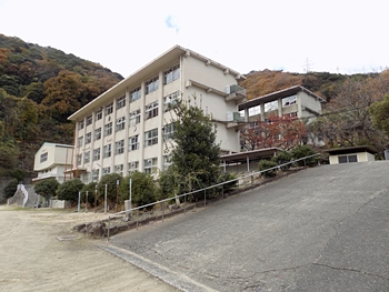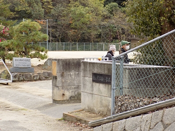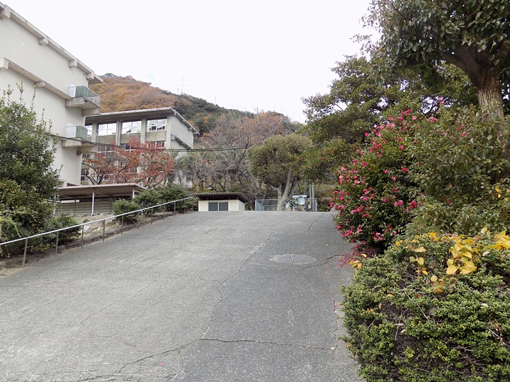 山田街道から旧鞆中学校への登校道に出ますと、ノンビリと校門へと向かいます。