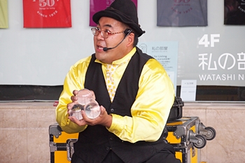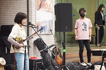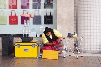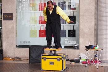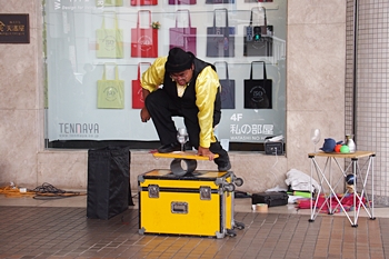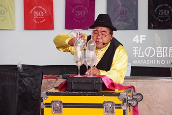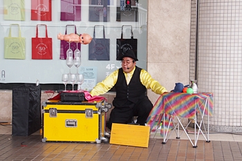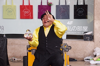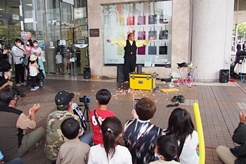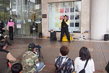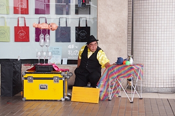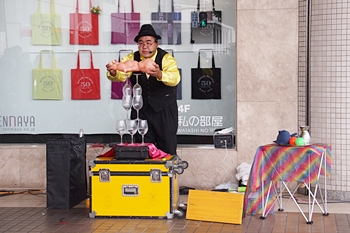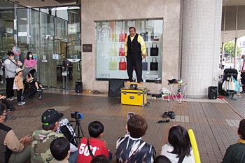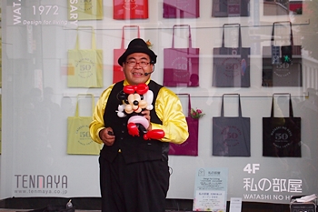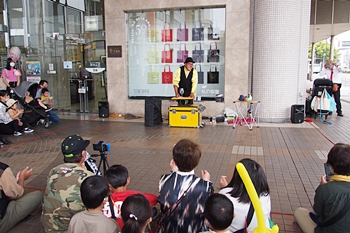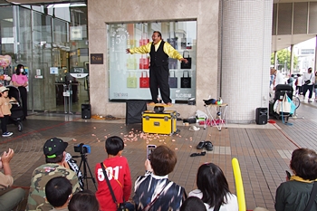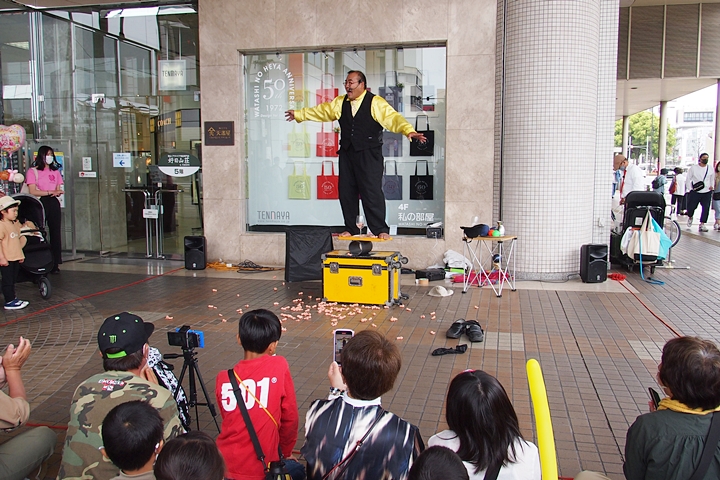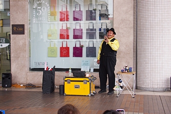 元町通りへ向かうため、信号を渡り天満屋福山店入口前では、大道芸の真っ最中(^.-)☆