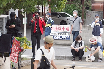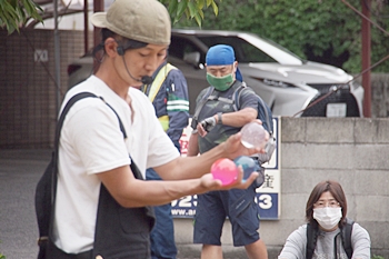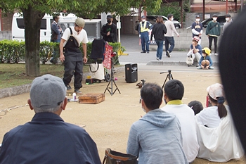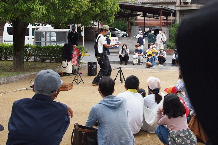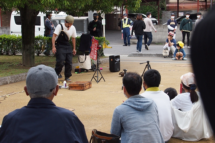 中央公園へと戻って来ますと、公園内の数ヶ所で大道芸を囲む人の輪が(^.-)☆