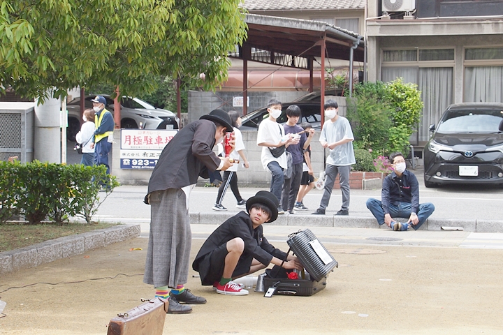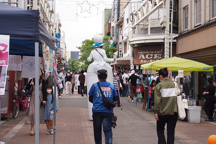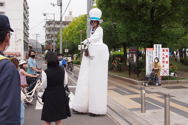 中央公園内の大道芸を暫く楽しんでおりますと、足長パフォーマーsanが…スタチューパフォーマーsanの脇を通り抜け、向かっておられますのは「ローズナード霞」方向へ。