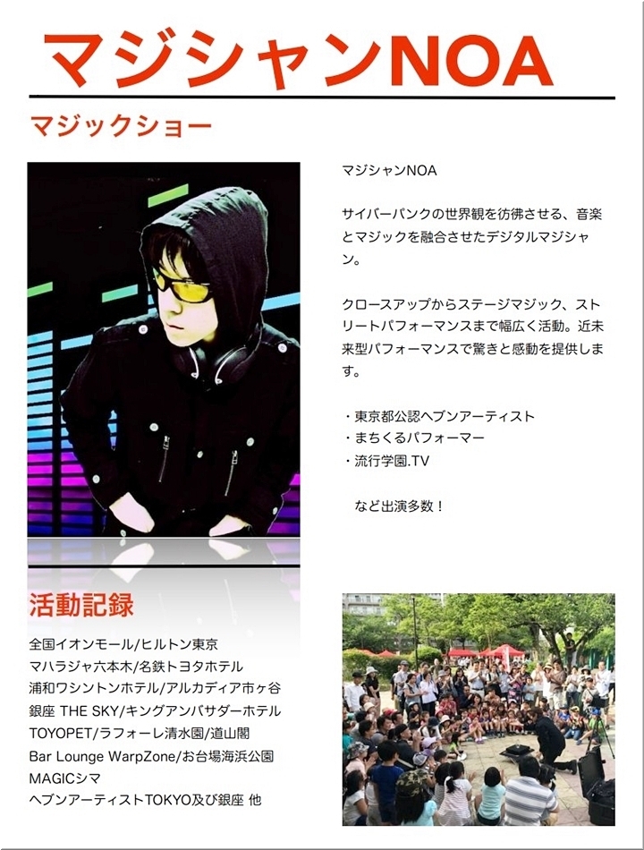 クロースアップからステージマジック、ストリートパフォーマンスまで幅広く活動。近未来型パフォーマンスで驚きと感動を提供します。