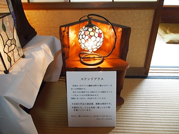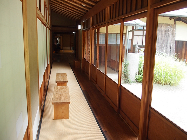和室に展示されました皆さんの力作を拝見後、庭園を臨めます廊下に出ますと、ここには長椅子が二つ設置されてありました。