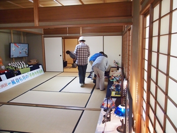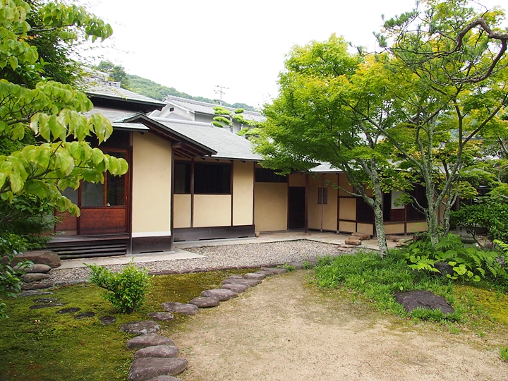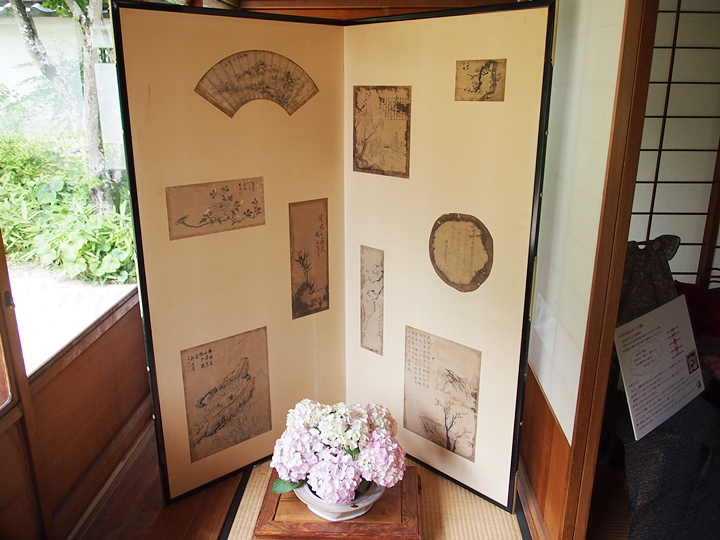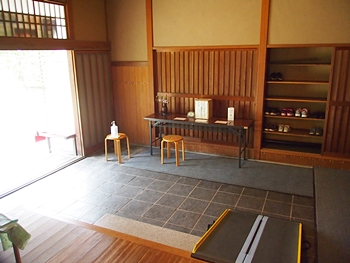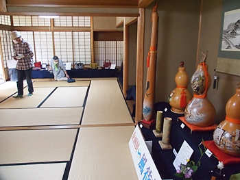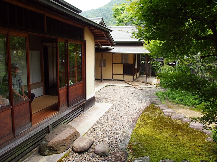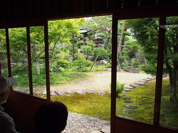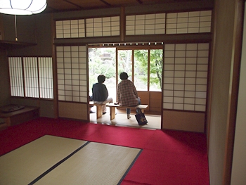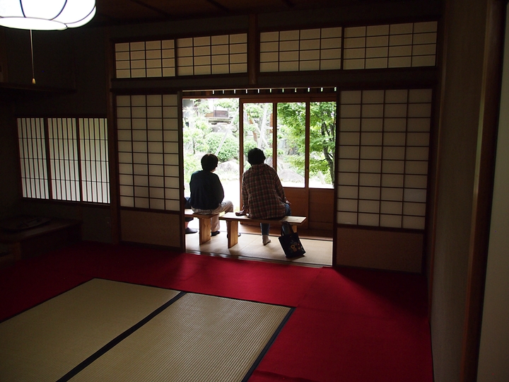 一通り展示作品を拝見しましたので、この辺で庭園を歩いてみよう…と、玄関方向に向かっておりますと、こちらの縁側でもご夫婦連れが長椅子に座られ庭園の景観を…