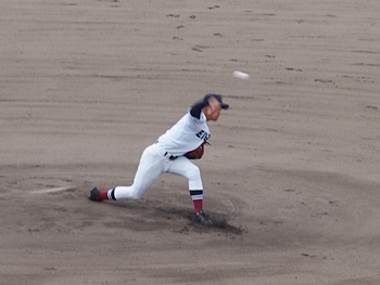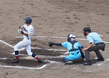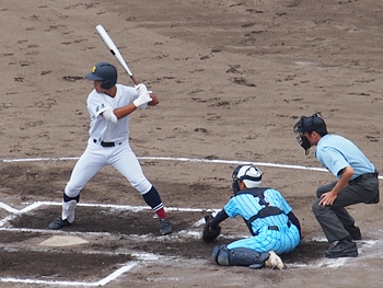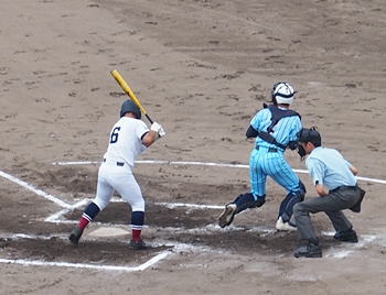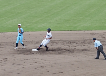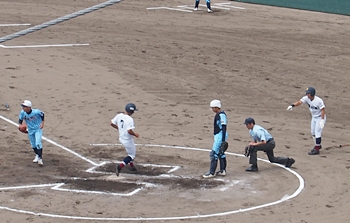 1回表の海田高校ですけど、簡単に討ち取られ、その裏の盈進高。いきなりチャンス到来ですネ。得点に?がりますでしょうか。