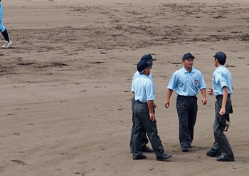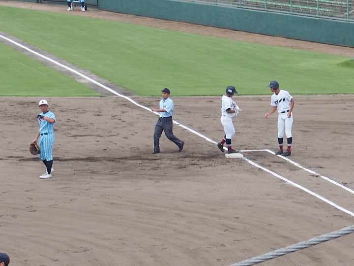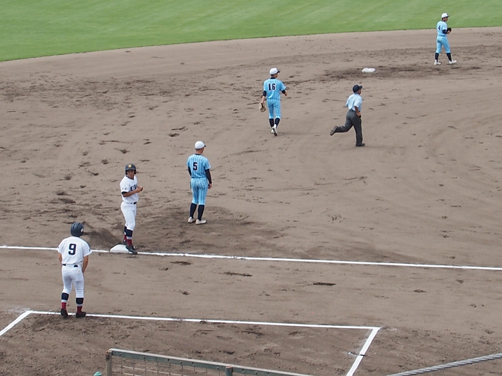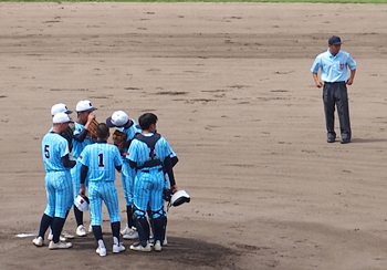 説明の無いまま、ゲームは再開。その直後に、今度は海田高の内野手がピッチャーマウンドに集まり、ベンチからの指示を確認です。追加点の入りますピンチ状況ですから、念入りに確認となりますのは当然なのかも…