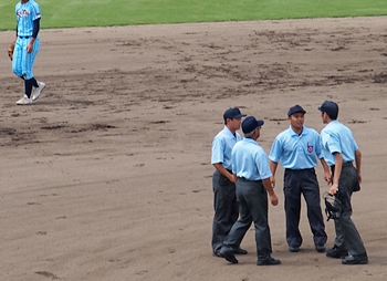 この時でしたか…審判団がピッチャーマウンド近くに集まり、何やら協議。何が問題なのか、野球規則に精通しておりませんGONsanには全く不明。