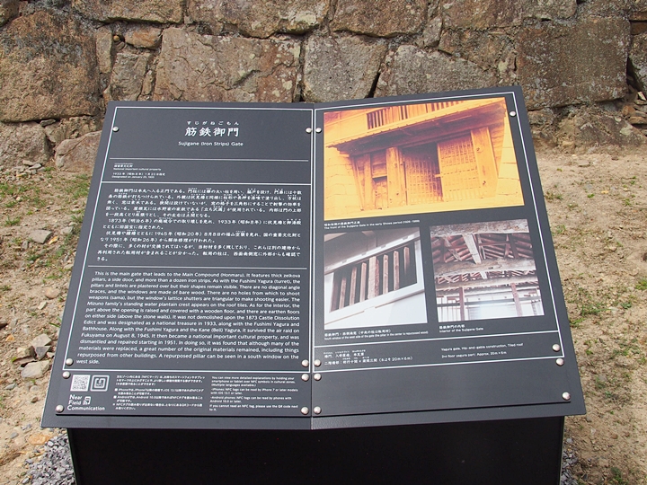 筋鉄御門は福山城を築城するに当たり、京都伏見城から移築したものと伝えられています。 桁行き10間、梁間3間、入母屋造り、本瓦葺で一階(城門部)の両脇を袖石垣が挟み、二階(櫓(やぐら)部)は一階と袖石垣の上に建つ典型的な櫓門です。この形式の櫓門は西日本に多く見られますが、櫓部内部の中央を板敷、その両脇を土間としている平面構成は現存する櫓門では筋鉄御門以外は確認されていません。