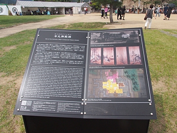 筋鉄御門を潜り本丸に入りますと、スグに「伏見御殿跡」の石柱が…その脇には、こんな「本丸御殿跡」の説明板がありました。