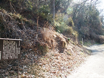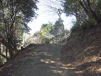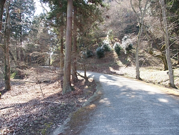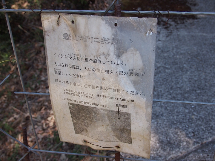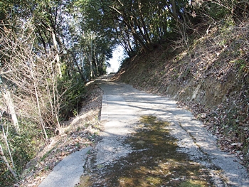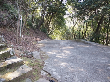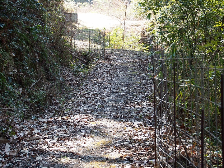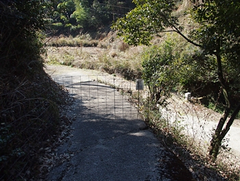 早速、柵を止めてあります針金をはずし柵の中へ。荒れてはいますが舗装された山道を上がって行きますと、チョッとしたスペースが…